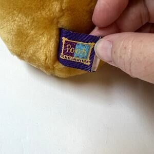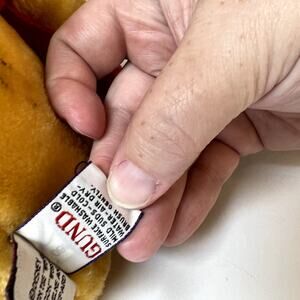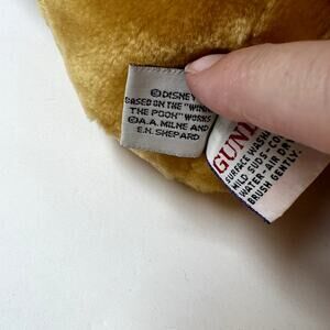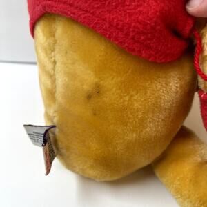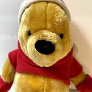 Gund Christmas Winnie The Pooh wearing a Santa hat and cute red mittens that are attached. There are a few small stains that I've shown in pictures above, otherwise he's in great chubby preloved condition!