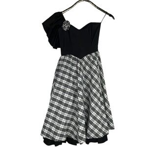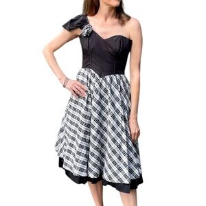 GUNNE SAX VINTAGE ONE SHOULDER PLAID TAFFETA 1980S PARTY PROM DRESS