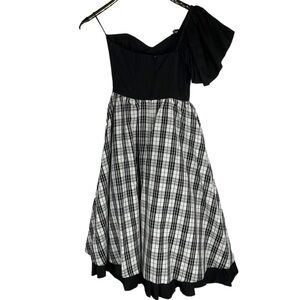 DETAIL: ONE SHOULDER WITH RUFFLE. BASQUE WAISTLINE. BONED SWEETHEART STRAPLESS BODICE. FULL PLAID SKIRT WITH DOUBLE LAYER BLACK HEM. ATTACHED PETTICOAT CRINOLINE. HIDDEN BACK ZIPPER. PLAID ROSETTE