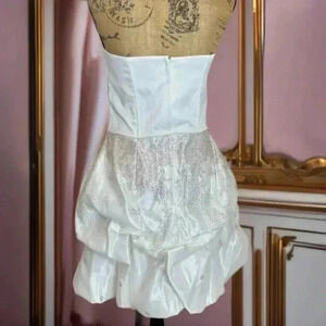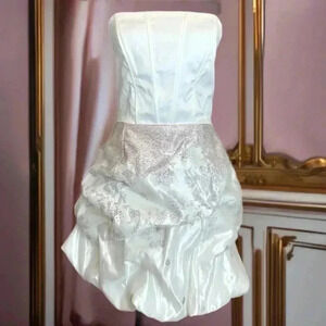 Strapless corset sweetheart top with tiered layered skirt bubble Y2K style with silver and champagne glitter sparkly accents. Perfect for winter formal dance bachelorette bridal shower etc. it’s a size 11 juniors which can fit up to size 10 women’s.