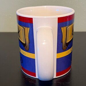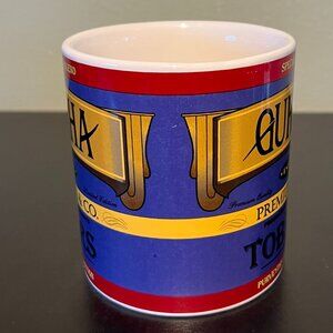 A large mug of strong coffee, a snifter of cognac, and a premium cigar go hand in hand. Oversized Gurkha Cigar and Tobacco logo ceramic coffee mug with one side featuring the iconic blue, yellow and red Gurkha Cigar logo from K. Hansotia & Co. Family Tobacco Merchants and their Gurkha Premium Blend Tobacco logo on the other. Measures almost 4.75” tall with a 3.75” diameter; 6” across including handle. White interior and large and comfortable easy-to-grip white handle. The mug weighs almost 1lb 10 oz. From Beach Cigar Group; Miami Florida.