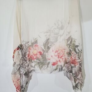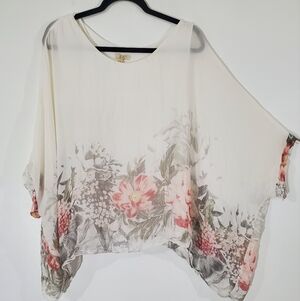 Beautiful floral print silk top with dolman sleeves. Lined.