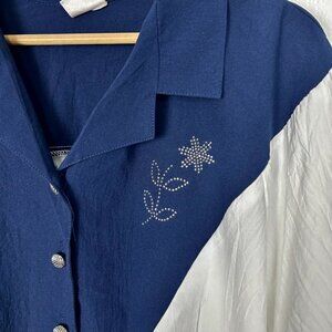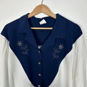 GW White and Blue rhinestoned Vintage Western Style Collared Blouse Sz. Large