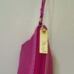 Vibrant fuchsia clutch with iconic YSL logo. Sleek wristlet design. Perfect for a bold statement.