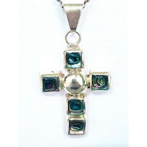 GX# Beautiful Abalone & Sterling 925 Silver cross pendant on an 20” sterling beaded chain.This item is sourced from an estate sale and the former owner had exquisite tastes. The truly great craftsmanship make this item a true work of art and with its pristine condition It is truly A great value of fine jewelry at costume pricing! Let’s make it yours!