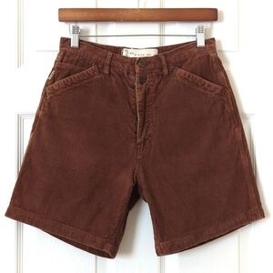 VTG and straight out of the 90s - These super cute carpenter shorts are high waisted with a flattering relaxed fit. They feature a double button and zipper closure, belt loops, and open pockets on the front and back. They are composed of a soft brown wide wale corduroy with a brand charm near the front right pocket and a brand patch on the back right hip. Casual and versatile, pair with crop tops or graphic tees and sandals for a classic retro look! A must have for Spring, Summer, and vacations. High quality!