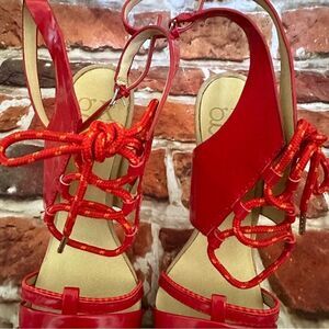stilettos with lace up detail, ankle strap, and island platform. The red laces have a bit of orange color on them. Details: heel 4-3/4", platform 3/4", high arch, the shoe fit is narrow. Faux patent leather.