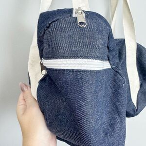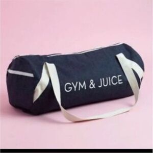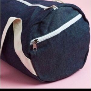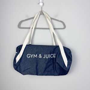 Super cute denim duffel bag from Fab Fit Fun box. Blue denim with white Gym & Juice graphic, white zippers, and off white straps. Side zipper and full top zipper. Straps show mild wear/dirt and strings inside but otherwise good condition. Approx 20x9 fully opened.