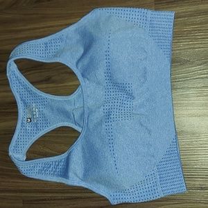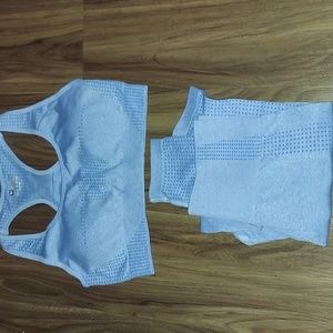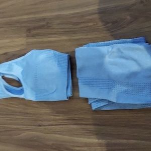 Blue sports set with bra inserts . so cutttte ! Size medium but stretchy can probally fit a small. 60%nylon 35% polyester 5%elastane New without tags never worn.