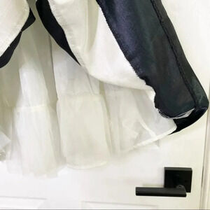 The perfect special occasion dress for your little fashionista. Cap sleeves in a timeless ivory and black stripe and black bow in front. Button back closure and lined with tulle.