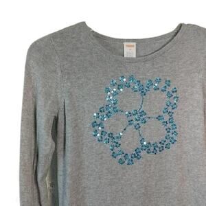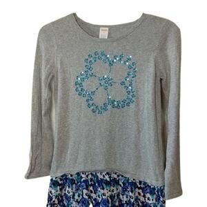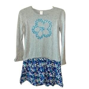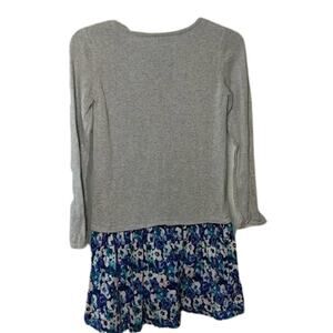 Gymboree Butterfly Garden Heather Gray Blossom Dress with teal, white and navy blue floral skirting. Pieced linen skirt with sweater top. Heather Gray top features embroidery and teal blue sequins in a flower pattern.