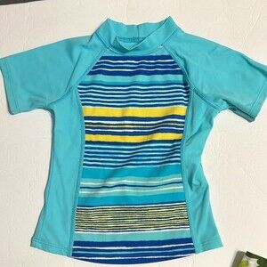 Lands' End Size Small / 4 blue and yellow striped swim shirt. Striped in front and solid in back.