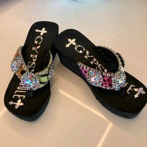 GYPSY SOULE Black Platform Flip-flops BeDazzle Swarovski Crystal Rhinestones 8