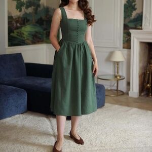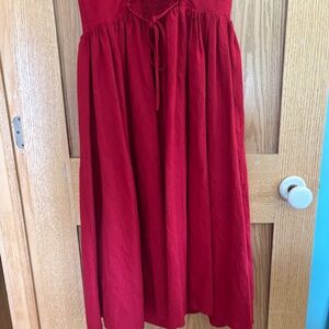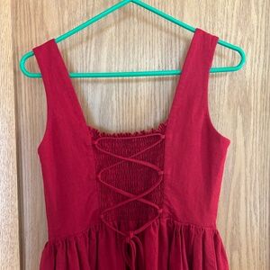Gaala Paris x Shirinatra limited edition Lizzy linen dress in red! This is an adorable, true red linen pinafore dress. It has pockets, decorative fabric covered buttons, side zip, and a smocked lace up back to get your perfect fit. Size 40 (large). See size chart in photos.