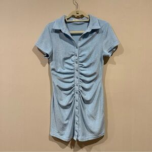 Stylish light blue dress with ruched front and button-up design. Perfect for casual outings.