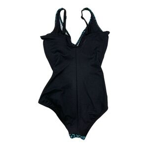 Stylish one-piece swimsuit with a vibrant leopard print. Features a mix of teal and black colors.