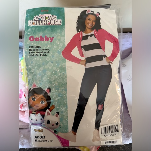 Spirit Halloween Gabby Dollhouse Gabby Costume. Pink hoodie, black and white striped gabby shirt & cat ears all included. The cat stick on patch no longer included