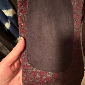 Burgundy & Grey sweater with grommets/ties and black suede elbow patches, size Large, Gabby Isabella brand, viscose/wool/nylon/acrylic blend, 21 inches pit to pit, 26 inches long . Excellent used condition