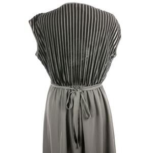 Brand new with tags lovely black evening dress by Gabby Skye in women's size 4. Top has a deep v neckline with striped velour detail. Empire waist with ties in the back. Pull on dress.