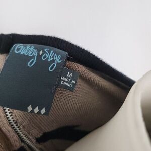 Gabby Skye Black Tan Geo Print Fit Flare Short Sleeve Knit Sweater Dress sz M
