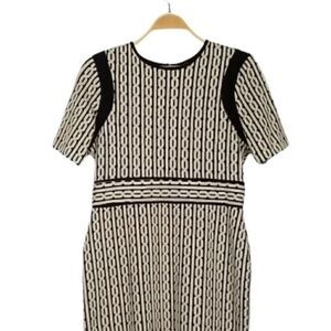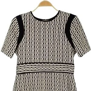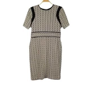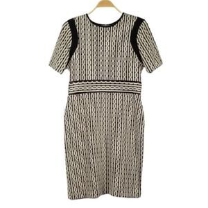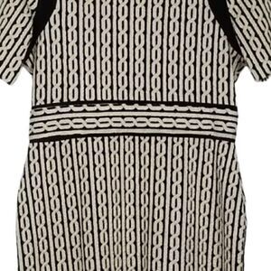Lovely textured knit black and off-white sheath dress. Short sleeves. Banded waist. Gold zipper on the back accented with a colorful green strip. Perfect for office, career, work, date night and casual looks!!