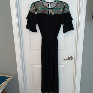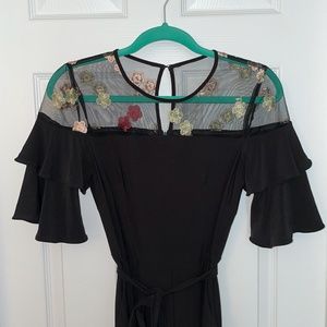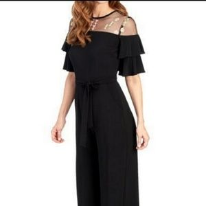 Gorgeous jumpsuit with sheer neckline and ruffle flutter sleeves