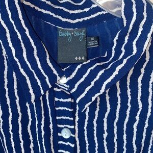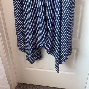 This dress is sleeveless with blue and white stripes. It’s has a zipper in the back with flare at the bottom. Length 43”