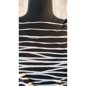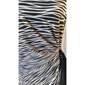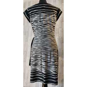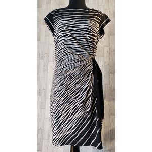 Gabby Skye Woman's Size 12 Black and Ivory Strip Slinky Sheath Dress. Has a tie on the side waist.