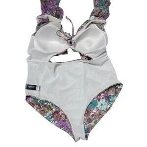 Swimsuits for All Garden Dream Pink Floral Cut Out Swimsuit Swimwear Plus Size 18 G/H Vacation Moderate Coverage. Fabric 82% Nylon, 18% Spandex. Lining: 100% Polyester Arms. Item in overall excellent gently used condition. Fabric on bottom does have very slight pilling in a couple of areas nothing remarkable.No known rips, tears, holes, stains or defects. Retails $148.
