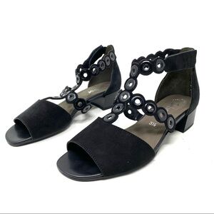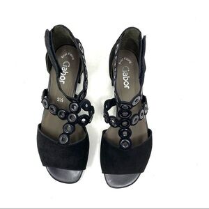 Your summer look is not complete without the sensational style of the Gabor 81.721 sandal from Gabor! The upper part is made of flexible suede. Open toe design. Velcro closure accompanied by elastic straps that allow an adjustable and adjusted use. The scalloped style straps are adorned with metal eyelets. Breathable leather lining that keeps your feet cool and comfortable. Lightly padded insole. Durable rubber outsole. Stacked block heel style. Imported. Measurements: Heel Height: 1 1/2 Inches