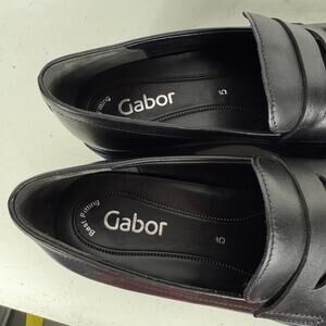 These are a UK marked size 5 which is equivalent to a us women's 7.5 per website. The Gabor Miley Loafer in black leather is a stylish and comfortable slip-on shoe for women. With a low block heel and standard shoe width, it is perfect for casual occasions in the spring, summer, and fall seasons. The shoe features a solid black color with a logo accent, making it a versatile addition to any wardrobe. Made in Slovakia, this shoe is designed for walking and offers a durable rubber outsole for added support. Ideal for everyday wear, these loafers from Gabor are both fashionable and practical.