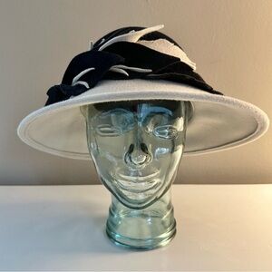 Absolutely gorgeous black and tan wool felt hat by Gabriel Amar for Frank Olive. It has beautiful felt leaves on the brim. The only sign of wear is some makeup on the inside of the brim that I’m sure can be cleaned off if you wish. But otherwise the outside of the hat is in perfect condition. 22” around inside of brim.