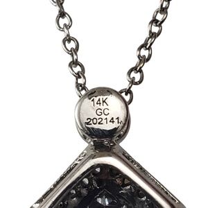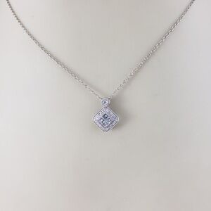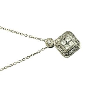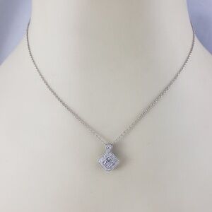 This sparkling pendant features four princess cut diamonds and 40 round brilliant cut diamonds set in 14K white gold. Suspends from a classic cable necklace.