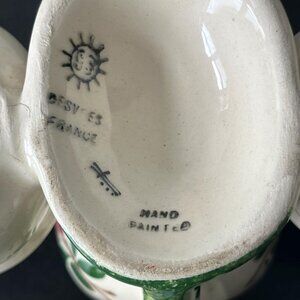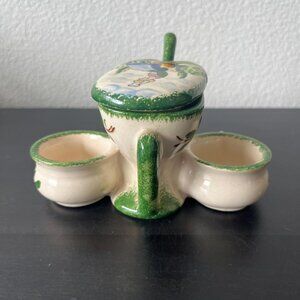 This three-part hand painted condiment dish was made by Gabriel Fourmaintraux in Desvres, a town in northern France known for its pottery. It has two open bowls (for salt and pepper), plus a covered center dish with serving spoon (most likely used for mustard). The GF factory began production in 1804 and closed in 1997, but this piece is not dated.