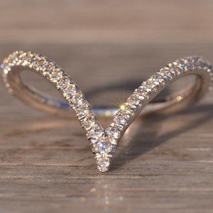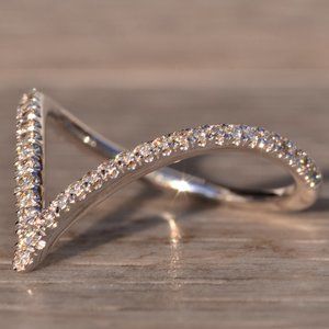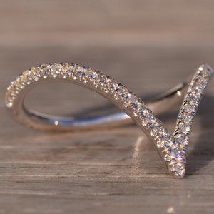 The 99th Avenue: Gabriel and Company Chevron Band in White Gold. The ring features a chevron shape or 'V' shape set with round brilliant cut natural diamonds. The diamonds have a total weight by measurement of 0.25 carats. The ring is expertly crafted in 14 karat white gold and is currently a finger size 6.5 yet can be adjusted to any finger size for an additional charge on request. The ring is also signed by its designer Gabriel and Company with a retail price of $1025.