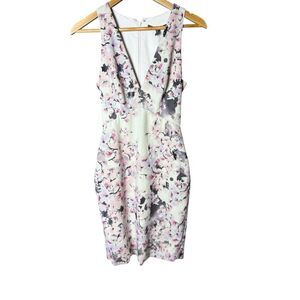 Sleeveless, plunge, wrap silhouette, floral print, graphic print, print, pattern, cut outs, ivory, knee length