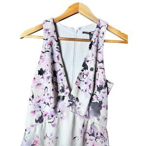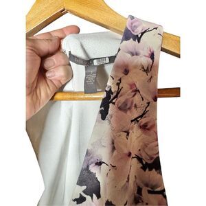 Sleeveless, plunge, wrap silhouette, floral print, graphic print, print, pattern, cut outs, ivory, knee length