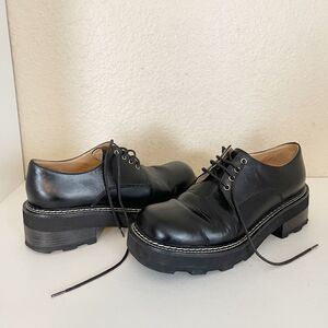 Edgy chunky loafers. Designer. Only flaw I noticed was the top of shoe lace is gone, there are signs of wear in the leather like creasing and the soles show minor use. Still Fabulous! Great condition.