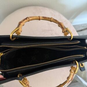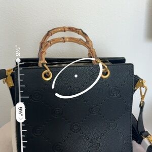 Material: Faux leather with pebbled texture, bamboo-style resin handles, gold-tone hardware