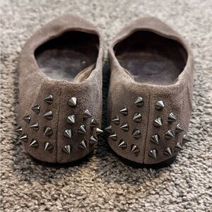 Step out in style with these chic taupe flats. Featuring a sleek leather design with studded details, these shoes are perfect for any occasion. 2nd owner but I never wore because they didn’t fit. Perfect neutral color with cool studs on the heels. Only flaw I see is the metallic film inside is cracking. *Price firm, thank you for understanding :)