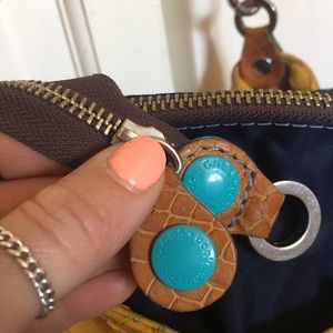 Very unique bucket style bag. Cylindrical in shape, it has a blue nylon zippered closure, flower feet, and adjustable cross body strap. The leather is a mustard yellow that has darkened as its aged. Shows regular signs of wear on the bottom of the bag. Blue leather wrapped strap showing a little wear but overall still in great shape.
