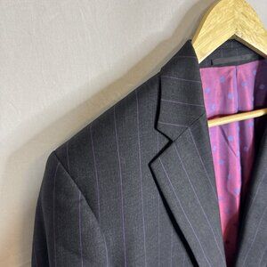 Sharp, premium Gabucci blazer made with Vitale Barberis Canonico Super 110’s Italian fabric. Charcoal grey with subtle pinstripes and a standout purple polka-dot lining. Two-button front, dual vents, and structured shoulders. High-quality tailoring, fully lined, classic business/formal piece.