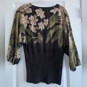 Stylish floral sweater with a V-neck and puff sleeves. Features a blend of green, brown, and cream colors with a touch of gold shimmer! Pre-loved and in great condition!