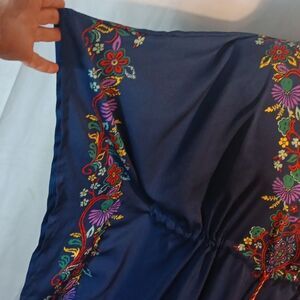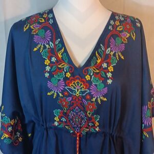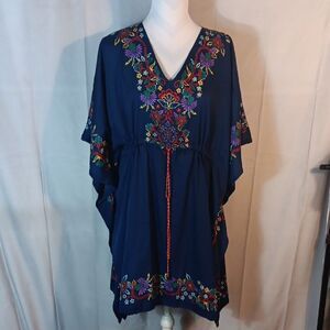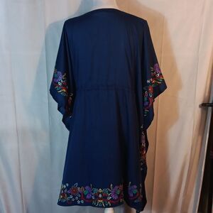 Elegant navy Gaby & Gracie swimsuit coverup perfect for any poolside or beach outing. It is a one size fits most with a pit to pit measuring 25" and a length of 35".