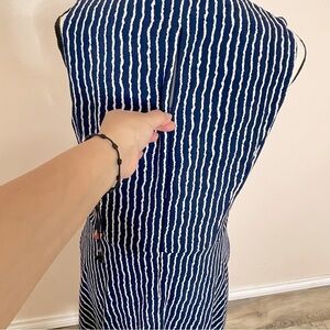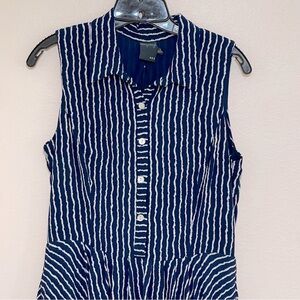 This dress is preowned, but it is still in great condition. It is very flattering, it has a fitted top and flares from waist down with a handkerchief hem. It is lined with a zipper on the back and front buttons. It is a wavy stripe with navy blue and white.