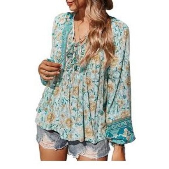✔️Boho Bohemian Printed Long Sleeve Blouse with elastic sleeve hem
