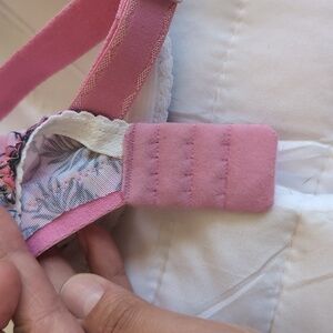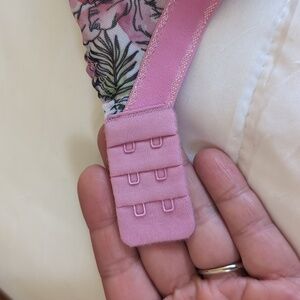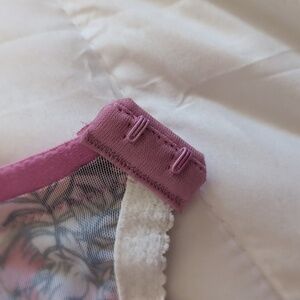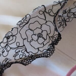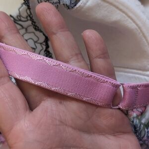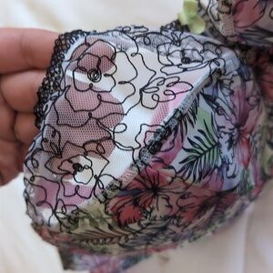 Gaia Women's Black Semi Soft 767 Petra Semi Padded Bra. Floral. Pink, multicolor with white and black lace detailing. Size 32I. Underwire. Light padding on lower half of the cup. Embroidered lace for the upper half. Bonings for stability. Made in Poland. Moderate smell of perfume (possibly from a sachet). Otherwise in great used condition. Clean, smoke free home.