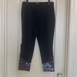 Gaiam Capri Legging Black and Purple Boho Print Mesh Size M. Excellent condition. Boho graphic print near calf with mesh accent panels.