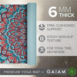 Extra-thick Premium Print Yoga Mats provide a stable, sticky, non-slip 5/6mm cushioned surface for your yoga practice. Perfect for home or studio use, this mat ensures the safety and comfort you need to enhance proper alignment and maintain poses and the additional cushioning helps to protect joints. Manufactured free of the top six most harmful phthalates, this mat is a healthier choice for both you and the planet! Please note a packaging change from 5mm or 6mm, but rest assured it is the same size and style mat, just in new and improved packaging. Also, printed yoga mats may release a harmless odor when first unwrapped. For best results unroll and air out your mat for 2-3 days before use. brand : Gaiam