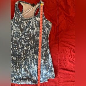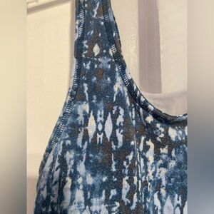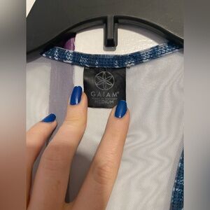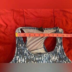 Stay stylish and supported during your workouts with this Gaiam racerback tank top in a bold blue abstract print. Designed with a built-in shelf bra and mesh back panel for breathability, this activewear essential is perfect for yoga, running, or gym sessions.